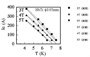 図に外径0.65mmのNbTi線の3T〜5TのもとでのIcの温度依存性の実測結果を、次の実験式による計算値(実線)とともに示す。ここでTc(0T)=9.2K、Hc(0K)=14.5Tとする。ただし図に示される通り、実測値と計算結果はかなり良い一致を示しており、多少の補正を加えればNbTiマグネットの設計に十分利用可能であることが確認された。また、初期冷却時間はNeガスを作用媒体とする熱スイッチが良好に作動し、冷却重量約160kgに対して、室温より励磁可能となるまで約65時間であった。