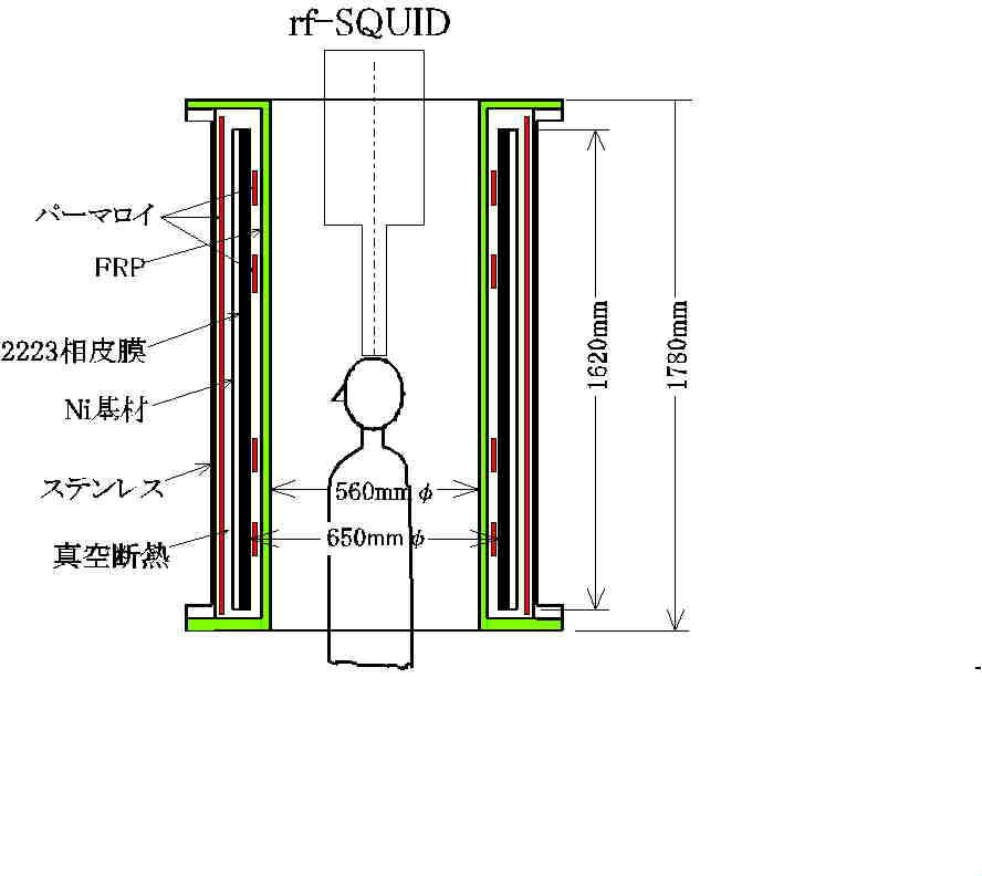 約700μm厚の2223相皮膜を形成した。この製法はNi円筒内面をブラストした後、Ag皮膜を形成し、その上に2223相皮膜を形成させた。なお、溶射したままの皮膜は非晶質で、超伝導特性が消失する。そのため、結晶化熱処理を行い超伝導特性を回復させた。このシールド円筒を図1に示すように、内壁はFRP、外壁はステンレス製の真空断熱容器内に格納し、冷却Heガスを循環させ、〜80Kの温度に保持して用いた。また、両開口端からの漏れ磁束対策のためにパーマロイリング(100mm幅x2mm厚)を4個、超伝導シールド円筒内に入れ、また、外壁ステンレス円筒の内側を全面にパーマロイ(1mm厚)で覆った形状に構成した。