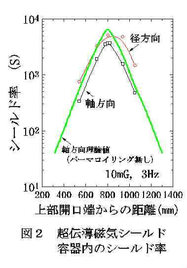 結果: 3Hz、10mGの交流磁気をヘルムホルツコイル(コイル間距離2m)によって発生させ、図1に示す超伝導磁気シールド容器内の磁気を、マグノメータ付rf-SQUID磁束計によって軸方向および径方向で測定した。