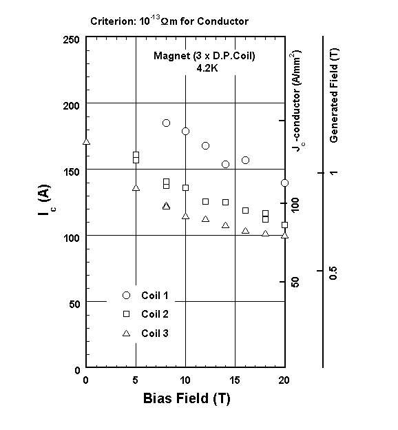 本発表では、Bi-2212/Ag多芯テープ線材を用いて強磁界発生用に作製したマグネットの磁界中励磁試験結果について報告する。試料は、ワインド&リアクト法を用いて作製したダブルパンケーキ積層型の小型マグネットである。マグネットの緒元を図1に示す。高さ36mm、外径88mm、有効内径30mm、総ターン数354、線材総長60m、コイル定数6.8mT/Aである。高磁界中での大きな電磁力(フープ力)を考慮し、100mm厚のAg-0.5wt%Mg合金テープを共巻きして補強とした。このマグネットについて、4.2K、20Tまでの種々の磁界中における特性評価を行った。磁界中励磁試験は、強磁界研究所(グルノーブル、フランス)の大口径ハイブリッドマグネットシステムを利用して行った。試験結果を図2に示す。コイル1に比べてコイル2,3の臨界電流値が低くなっている。コイル2,3間の接続部で大きな抵抗が観測されたことから、この臨界電流値の低下は発熱の影響によるものと推察される。20Tの外部磁界中におけるコイル1の臨界電流は140A(導体電流密度110A/mm2)であり、このときの酸化物マグネットの発生磁界は0.98Tであった。酸化物高温超伝導材料を用いて、直径30mm程度の空間に発生させた磁界としては世界最高レベルであり、今後の実用化への大きな可能性の実証となった。