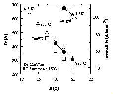 この図より、4.2K、20T以上では熱処理温度が高いほどIc/Jcが高くなることがわかる。また、1.8K、21Tにおいて720℃で熱処理した試料のJcは102A/mm2であり、上記目標値を満たすことが確認できた。このときのn値は49で同じく目標値を達成できた。