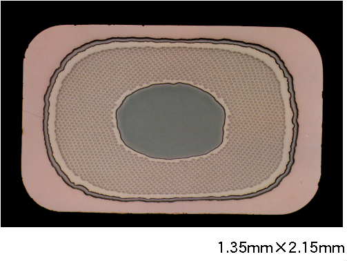 図1に試作した導体の断面のSEM写真を示す。この導体は1.35mm×2.15mmの平角形状で、フィラメント数は35,910本、銅比は0.5である。導体断面中央の白い部分が補強材のTaで、断面中の11%を占めている。導体には650〜700℃の反応熱処理を施した。強度測定は常温および4.2Kで引張試験を行った。