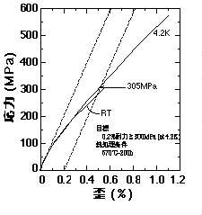図2に開発した導体の応力−歪み曲線を示す。670℃-200hの反応熱処理を施した導体では、4.2Kにおけるヤング率:120GPa、0.2%耐力:305MPa、引張強度:570MPaを示した。Taによる補強を施していないNb3Sn導体では、0.2%耐力は200MPa前後であることから、Ta補強により耐力は約50%向上し、強度の目標である“0.2%耐力≧300MPa(at4.2K)”を満足した。本導体の応力−歪み曲線で最初に現れる折れ曲がりは安定化銅、ブロンズの降伏によるものと考えられるが、これらの降伏後もTaは弾性変形するので、応力−歪み曲線の傾きが小さくなるのが抑えられ、0.2%耐力が向上していると考えられる。