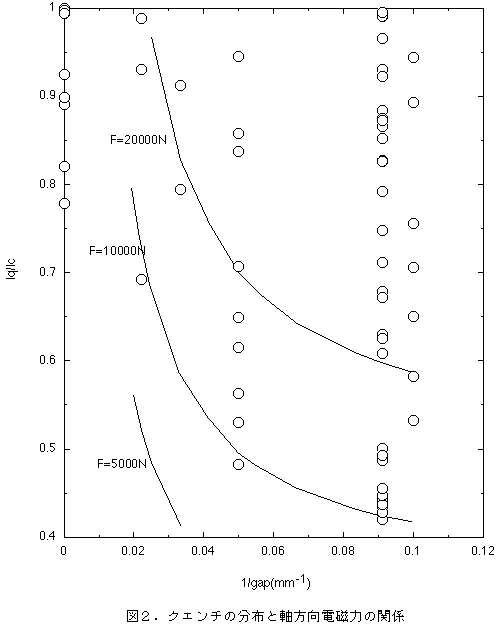 ギャップの逆数が0である点は、コイル単体で励磁した場合である。実験結果より、ギャップが小さくなるほど、低い電流でクエンチする可能性があり、ギャップが大きくなれば、比較的電流の高いところでクエンチすることがわかる。各ギャップにおける最低のクエンチ電流において、コイル間の吸引力は10000N近傍であり、不安定性の下限がコイル間吸引力とよく一致することが見いだされた。