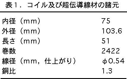 製作したコイルの諸元を表1に示す。超伝導線材はNMRによく使用される低銅比のNbTi線材を用いた。コイルはアルミ合金製の巻枠を使用し、エポキシ樹脂を塗り込みながら巻線した。スプリットコイルのギャップは、巻枠間にはさむステンレスの円盤の厚みで変化させ、巻枠のフランジ部分になるべく均一に力が加わるようにした。コイルの局所最大磁場を図1に示す。電流は10%ほどしか変化しない。単体の場合と、最小ギャップである10mmの場合とで、臨界コイルのギャップを10mm〜45mmの間で変化させて実験を行った。